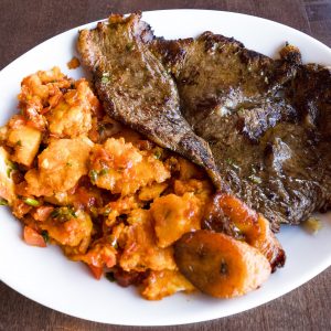 Carne asada con migas de mi tierra/Grilled steak with corn cake bits