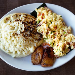 Huevos pericos con arepa y queso/Scrambled eggs with corn cake and cheese