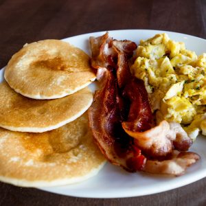 Pancakes con huevos pericos, bacon O salchicha/ Pancakes with scrambled eggs, bacon or sausage